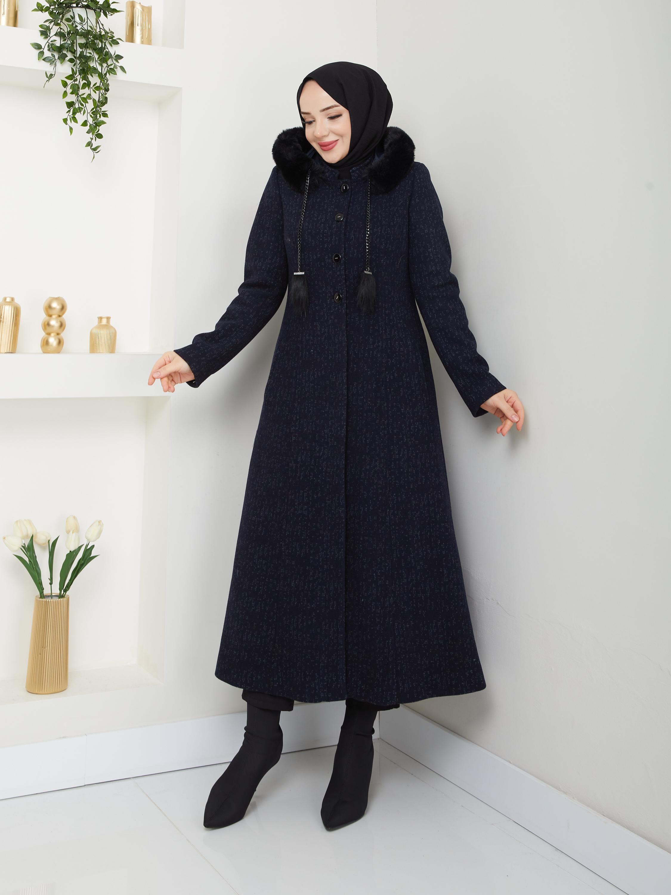 Doque Kışlık Kadın Kaban Kalın Kaşe Düğmeli Kapşonlu Lacivert 57055