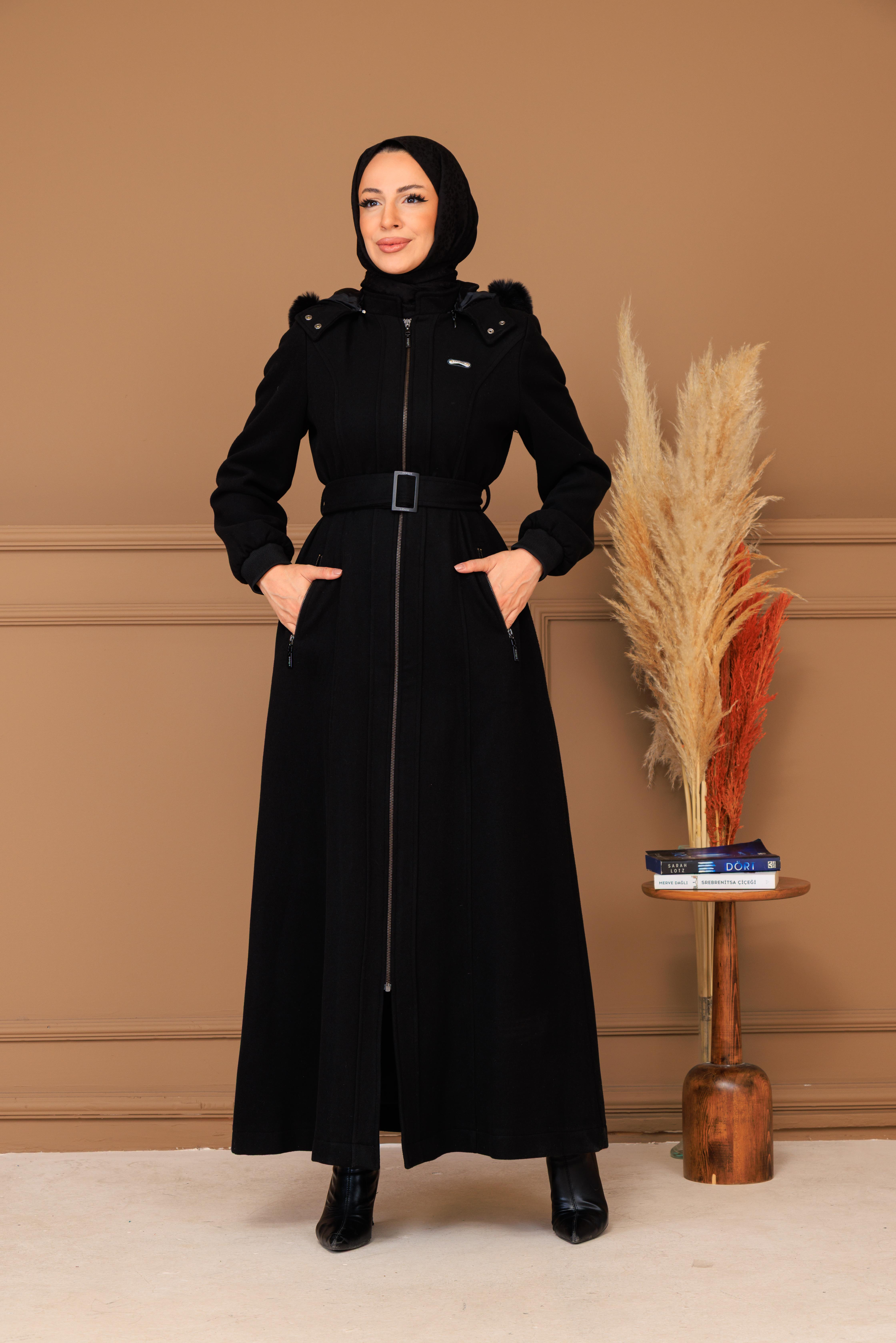 Doque Kışlık Kadın Siyah Kaşe Pardesü Fermuarlı 58011